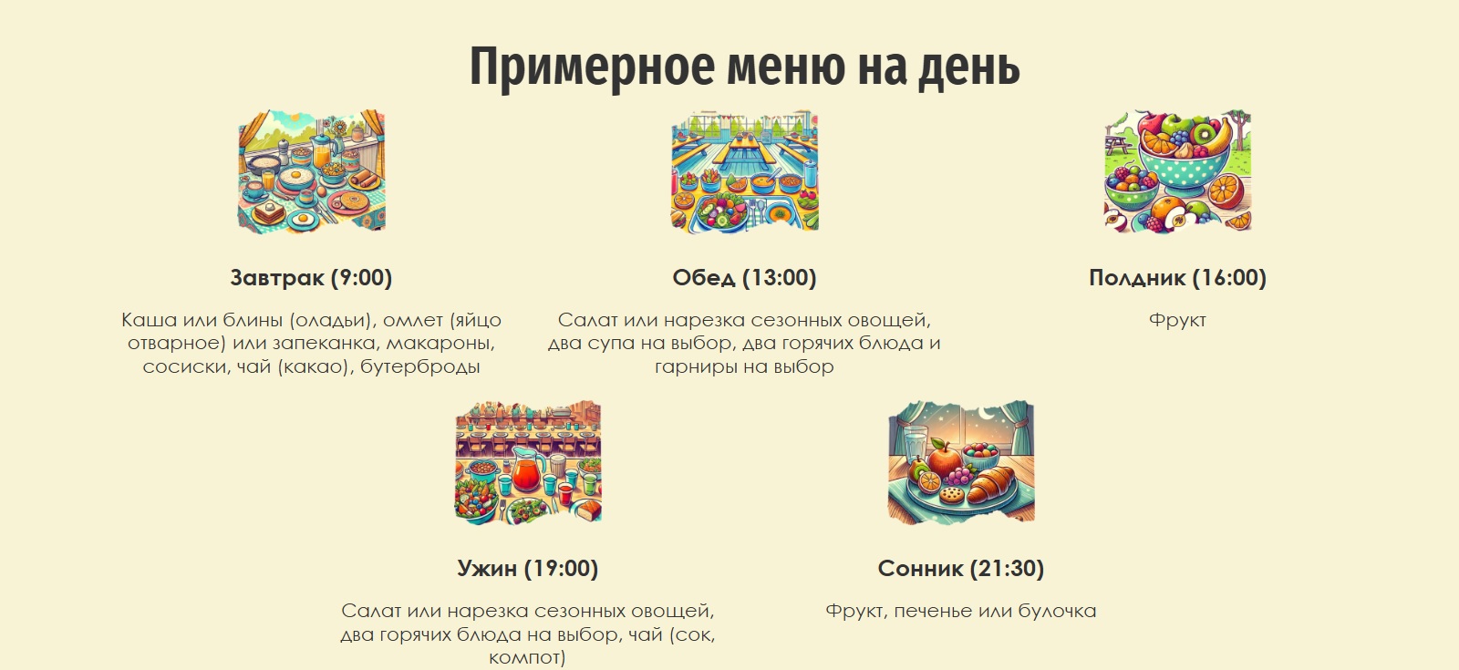 | Условия размещения | Дети проживают по 3 человека с удобствами в номере или блоке (туалет, раковина, душевая) |
